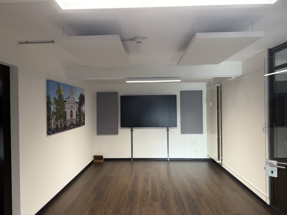 Dans la salle de conférence, six panneaux standards ont été installés au plafond, tandis que deux panneaux standards et deux panneaux imprimés ont été posés aux murs. L’ensemble des solutions a été conçu, fabriqué et mis en œuvre par nos soins, avec une attention particulière portée à l’efficacité et à la discrétion.