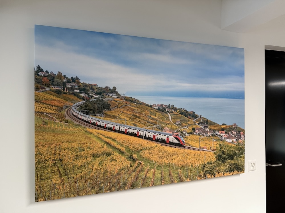 Huit de nos panneaux acoustiques standards Swiss Made ont été suspendus au plafond des bureaux, complétés par quatre panneaux acoustiques imprimés fixés aux murs, réalisés avec les visuels fournis par les CFF. Cette combinaison a permis d’allier performance acoustique et intégration esthétique.